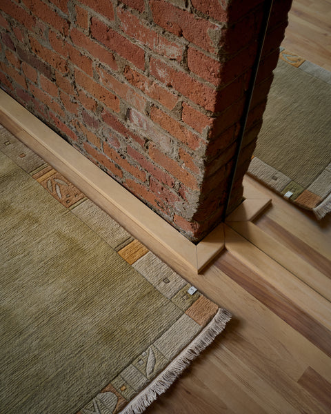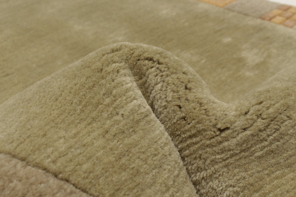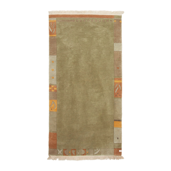 100% wool hand-knotted rug. this piece was crafted in nepal and features a tonal field framed by a modern border of geometric forms.