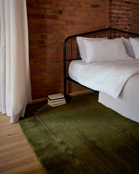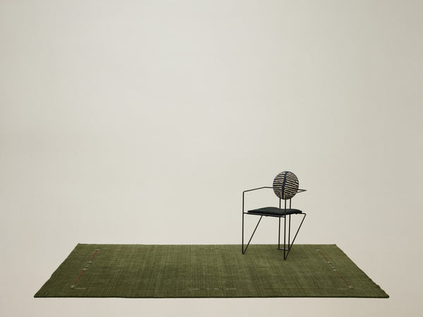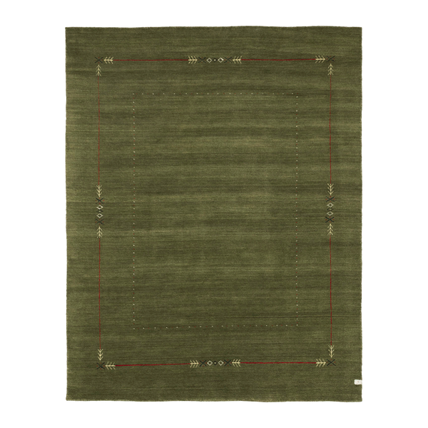 100% wool hand loomed in india, this plush gabbeh rug features an organic field with subtle tribal motifs.