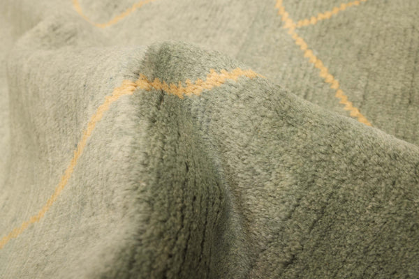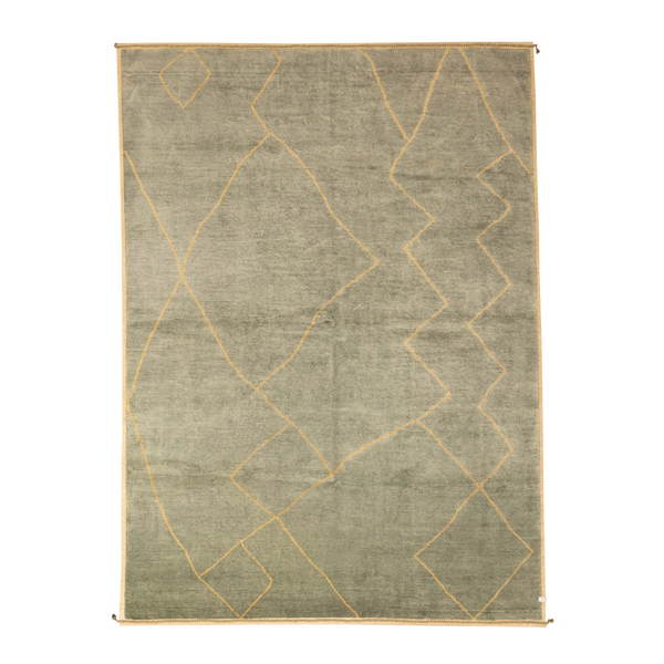 this hand knotted rug features a soft, modern field with an abstract linear pattern woven in a warm contrast tone. the gentle variation in the green ground adds depth without overpowering the minimalist design. crafted from high quality wool, the material lends both richness and durability to the piece.