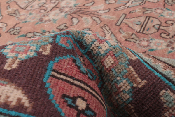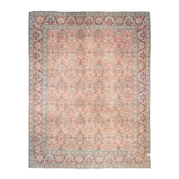 100% wool hand-knotted vintage turkish rug, featuring a repeating garden motif framed by a layered border in tea-stained pastels.