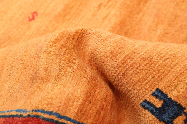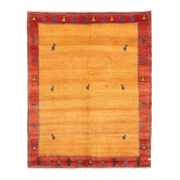 100% wool hand-knotted gabbeh rug featuring a sun-drenched field with tribal figures and a tonal vermilion border.