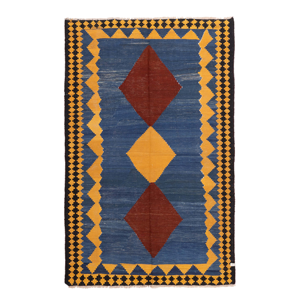handwoven turkish flatweave rug, featuring a striking trio of diamond motifs set against a deep blue ground.