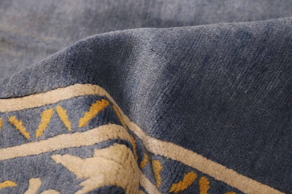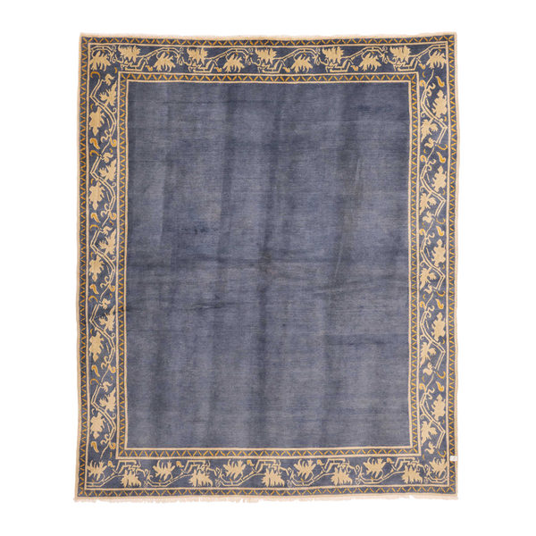 100% wool hand-knotted nepalese rug, featuring a rich blue field, framed by an intricate golden vine border.