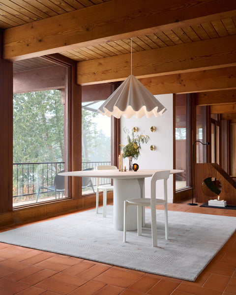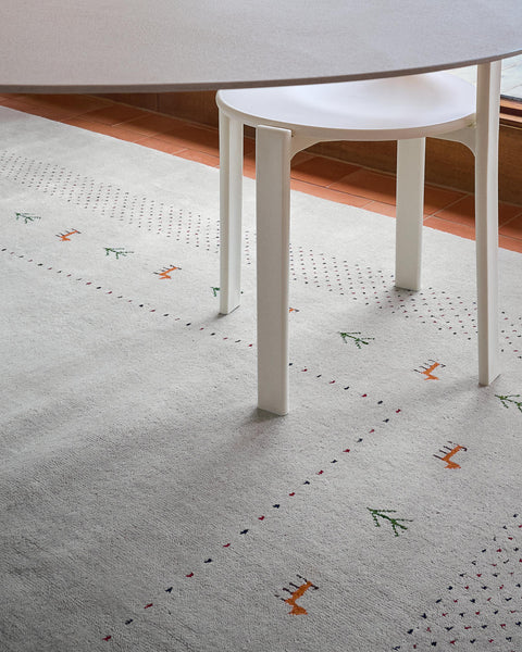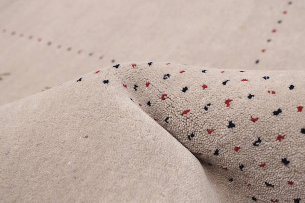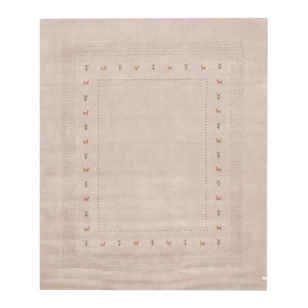 100% wool hand-loomed indian gabbeh rug featuring a solid field, tribal motifs and a subtle dotted frame.