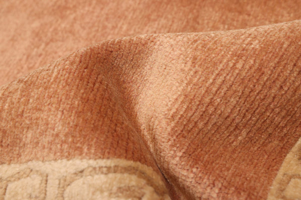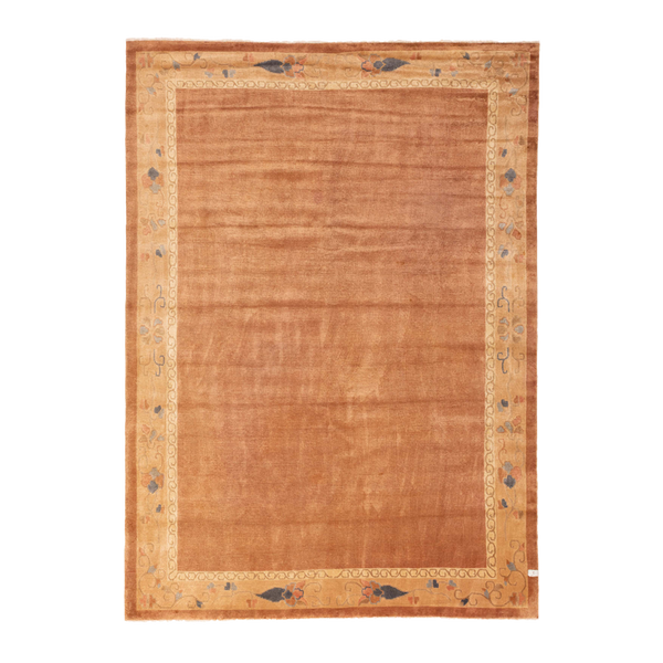 100% wool hand-knotted nepalese rug, featuring a rich, heathered field, framed by a delicate botanical border.